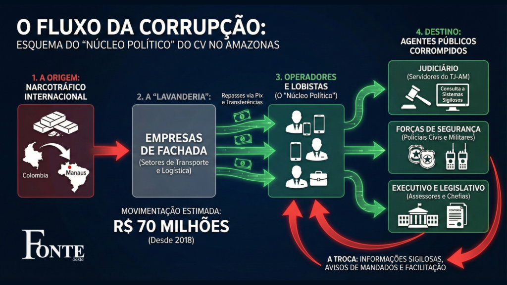 Essa rede funcionava como uma troca de favores muito perigosa. De um lado, criminosos usavam empresas de transporte para trazer drogas da Colômbia; do outro, pessoas infiltradas em cargos públicos ajudavam a esconder esses crimes. Entre os nomes investigados está o de Anabela Cardoso Freitas, que foi chefe de gabinete da prefeitura de Manaus e é suspeita de movimentar mais de um milhão de reais para a facção. A investigação também aponta que funcionários do Tribunal de Justiça recebiam pagamentos por fora para avisar os bandidos antes de a polícia chegar para prendê-los.